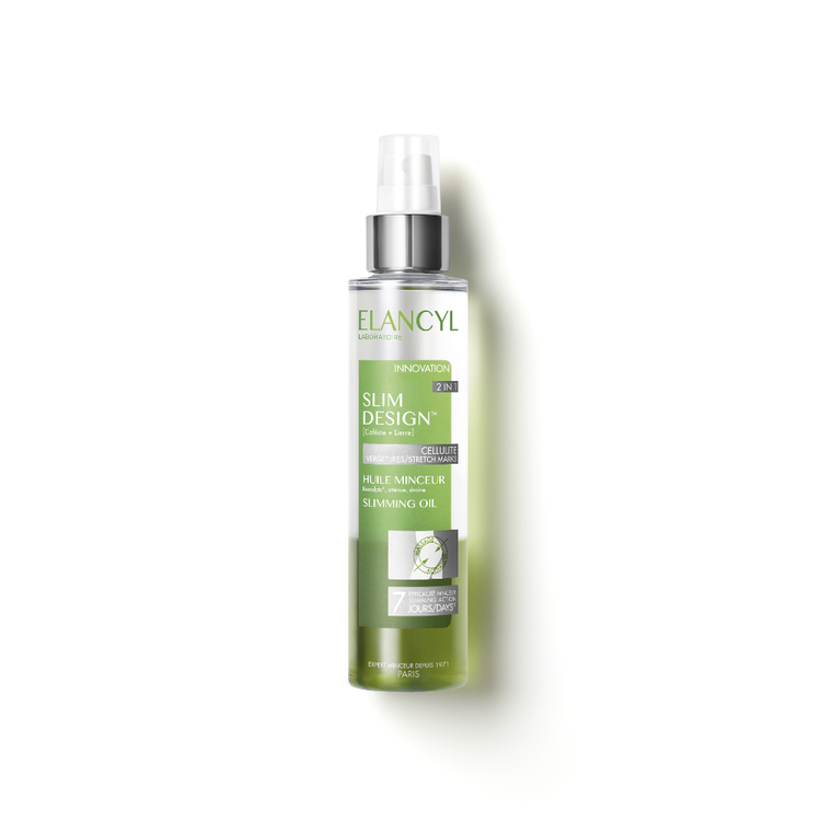 Το Slim Design Έλαιο Αδυνατίσματος της Elancyl συμβάλλει στην καταπολέμηση της κυτταρίτιδας και την εντατική λείανση της όψης φλοιού πορτοκαλιού, ενώ παράλληλα προλαμβάνει την εμφάνιση των ραγάδων.Έχει επανορθωτική δράση και διορθώνει τις πρόσφατες ραγάδων, χάρη στο έλαιο καμελίνης. Αποτοξινώνει και αποσυμφορεί, χάρη στον κισσό και τις κατάλληλες κινήσεις μασάζ.