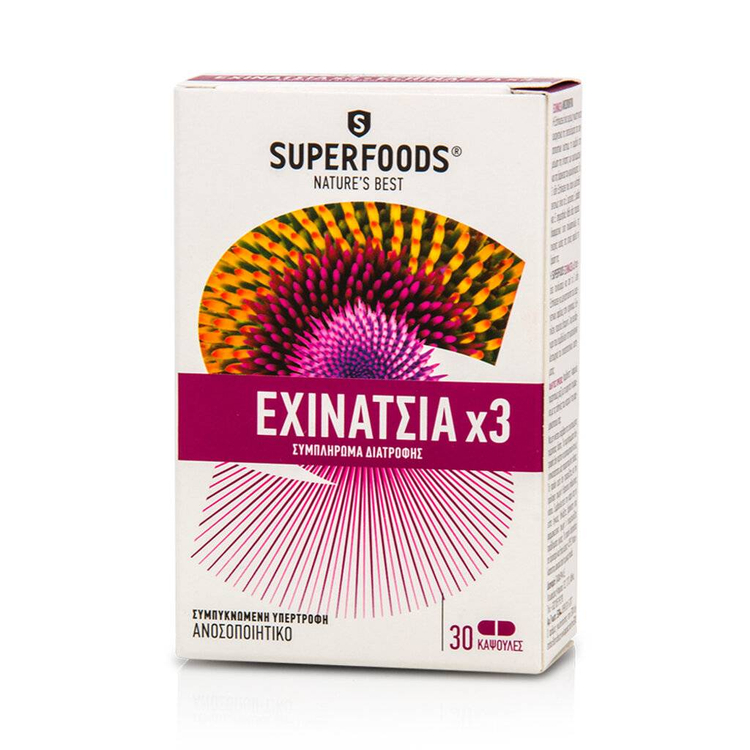 Η Superfoods Εχινάτσιαx3 περιέχει συνδυασμό και από τα 3 είδη Εχινάτσια για μεγιστοποίηση το ευεργετικού οφέλους στον οργανισμό.