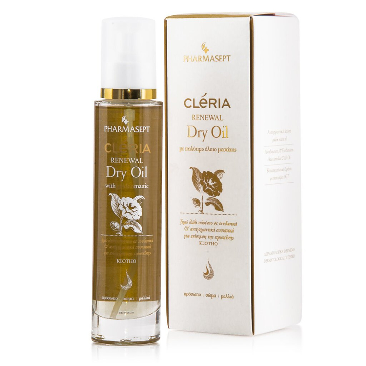 Το ξηρό έλαιο Renewal Dry Oil της Pharmasept, είναι πλούσιο σε ενυδατικά και αντιγηραντικά συστατικά. Το έλαιο πολύτιμης μαστίχας σε μορφή συμπυκνωμένου σε δραστικά συστατικά ελαίου που περιλαμβάνεται στη σύνθεση του Pharmasept Cleria Renewal Dry Oil, αυξάνει την πυκνότητα και την ελαστικότητα της επιδερμίδας έως και 23% μετά από 28 ημέρες χρήσης.