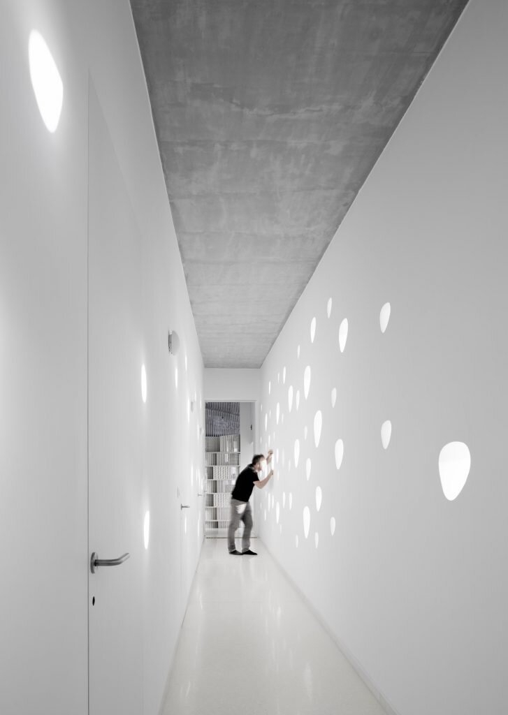 Οι προσόψεις έχουν κλίση προς τα μέσα για να δώσουν στις τρεις αυλές το πλεονέκτημα της σκιάς. Η μια από αυτές έχει πισίνα σε σχήμα ματιού, η άλλη μπορεί να λειτουργήσει ως καθιστικό και η τρίτη έχει χαλίκι στο πάτωμα.